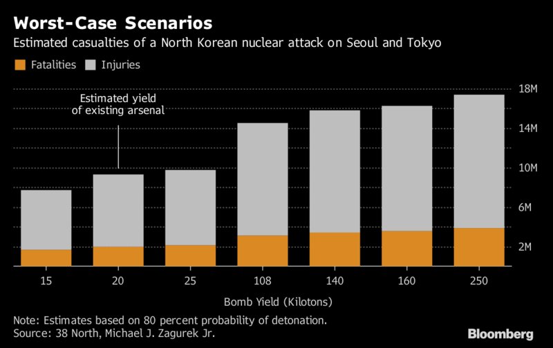 Εάν ο Kim Jong Un εξαπέλυε πυρηνική επίθεση ενάντια στη Σεούλ και στο Τόκιο –δηλαδή δύο πόλεις οι οποίες είναι εντός της εμβέλειας του οπλοστασίου του- τότε θα έβρισκαν τον θάνατο 2,1 εκατ. άνθρωποι ενώ θα τραυματίζονταν τουλάχιστον 7,7 εκατ., τονίζει η 38 North.