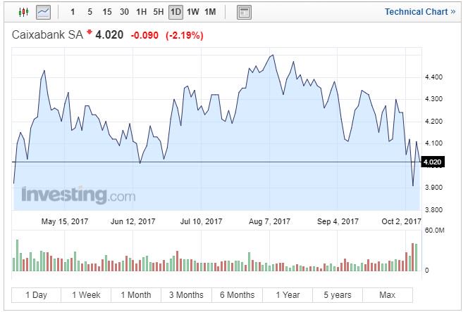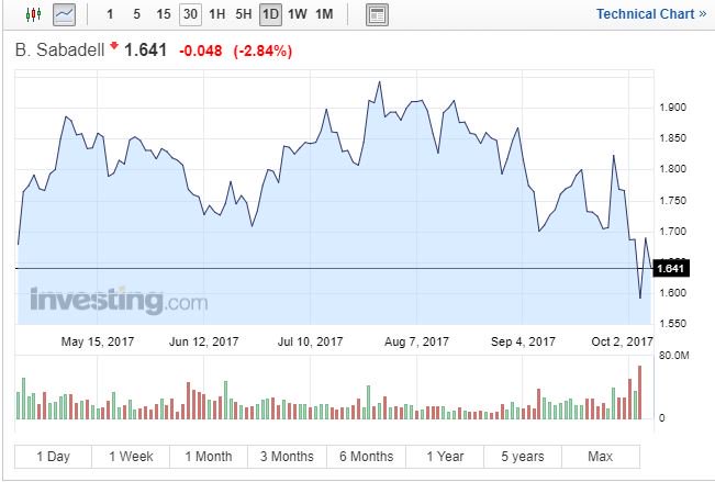 (upd) Ισχυρές πιέσεις δέχονται οι μετοχές των ισπανικών τραπεζών λόγω πολιτικής αβεβαιότητας, καθώς η Banco de Sabaddell αποφάσισε την απομάκρυνση της εταιρικής της βάσης από την Καταλονία.