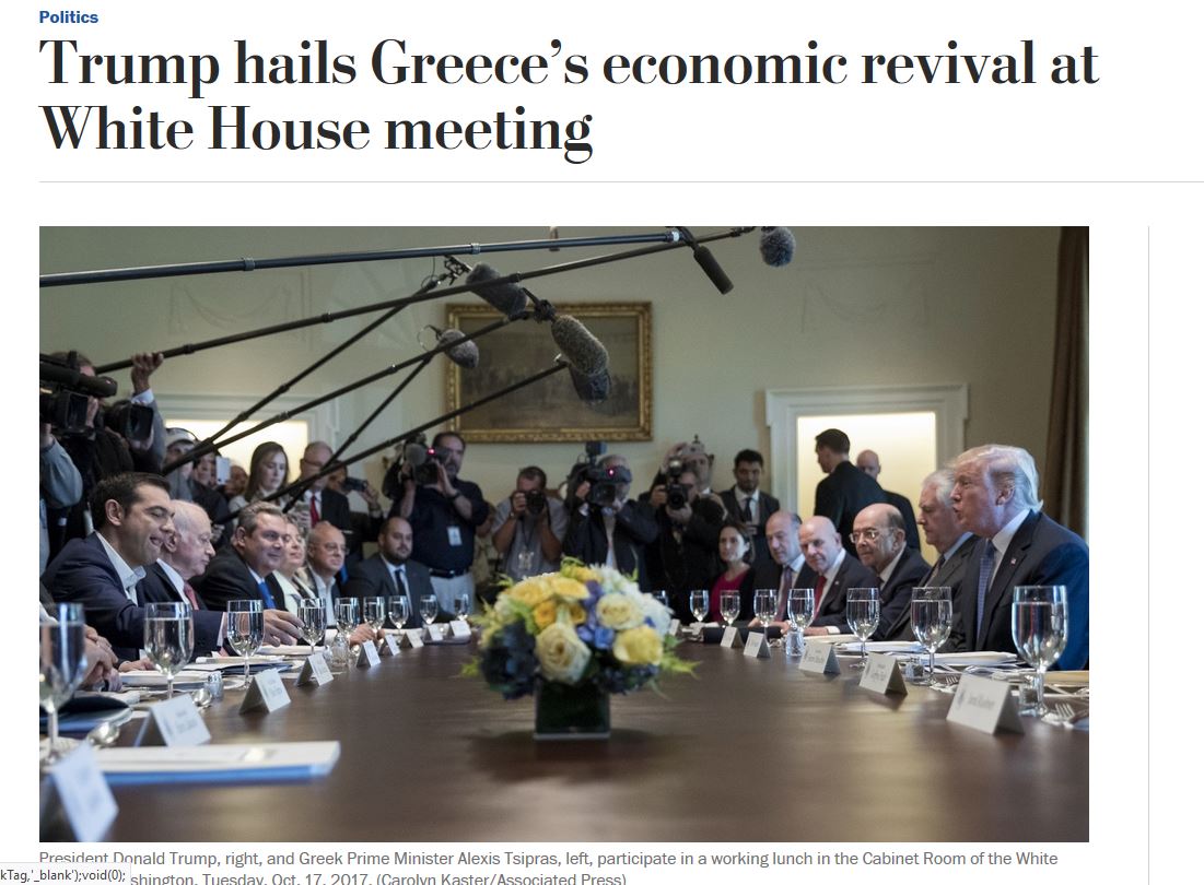 H Washington Post σε δημοσίευμά της για τη συνάντηση Trump - Τσίπρα αναφέρει ότι τη δέσμευση των Ηνωμένων Πολιτειών για στήριξη της οικονομικής ανάκαμψης στην Ελλάδα επιβεβαίωσε ο πρόεδρος D. Trump στο Λευκό Οίκο χθες (17/10).