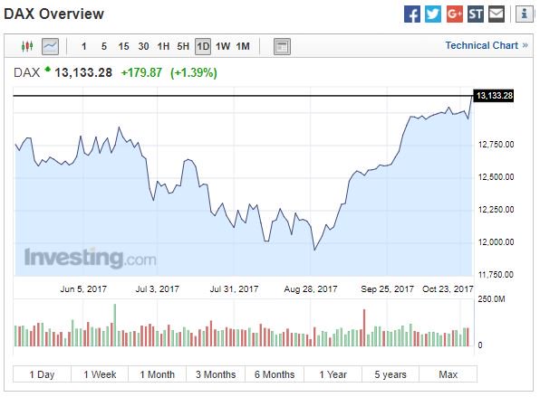Στη Φρανκφούρτη, ο DAX «εκτοξεύτηκε» κατά 1,4% και έκλεισε στις 13.133,28 μονάδες, που αποτελεί νέο ιστορικό υψηλό.