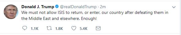 «Δεν πρέπει να επιτρέψουμε στο ISIS να επιστρέψει, ή να εισέλθει, στη χώρα μας, αφού τους νικήσουμε στη Μέση Ανατολή και αλλού.