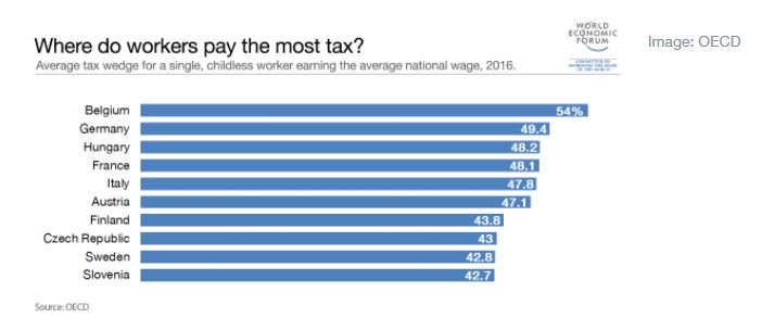 Στην πρώτη θέση βρίσκεται το Βέλγιο, όπου οι εργαζόμενοι πληρώνουν περισσότερα από τα μισά χρήματα, που λαμβάνουν, σε φόρους και ασφαλιστικές εισφορές.