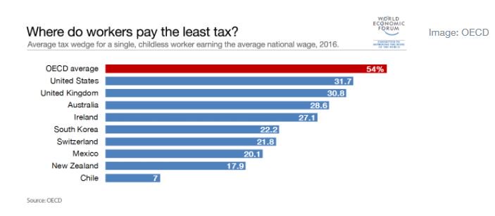 Σύμφωνα με τα στοιχεία της έκθεσης Taxing Wages 2017, ο μέσος όρος στις 35 χώρες - μέλη του ΟΟΣΑ είναι να συνεισφέρει ένα άτομο πάνω από το ένα τρίτο των ετήσιων εσόδων του σε φόρο εισοδήματος και ασφαλιστικές εισφορές.