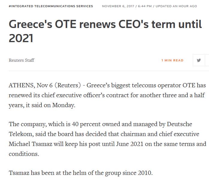 Πιο συγκεκριμένα, όπως αναφέρει το δημοσίευμα «ο ΟΤΕ ανακοίνωσε ότι το Διοικητικό Συμβούλιο αποφάσισε κατά τη συνεδρίαση της 3ης Νοεμβρίου 2017, την ανανέωση της διάρκειας της σύμβασης του Διευθύνοντος Συμβούλου, κ. Μιχάλη Τσαμάζ μέχρι την ημερομηνία της Ετήσιας Τακτικής Γενικής Συνέλευσης των Μετόχων που θα πραγματοποιηθεί τον Ιούνιο του 2021, με τους ίδιους όρους και προϋποθέσεις».