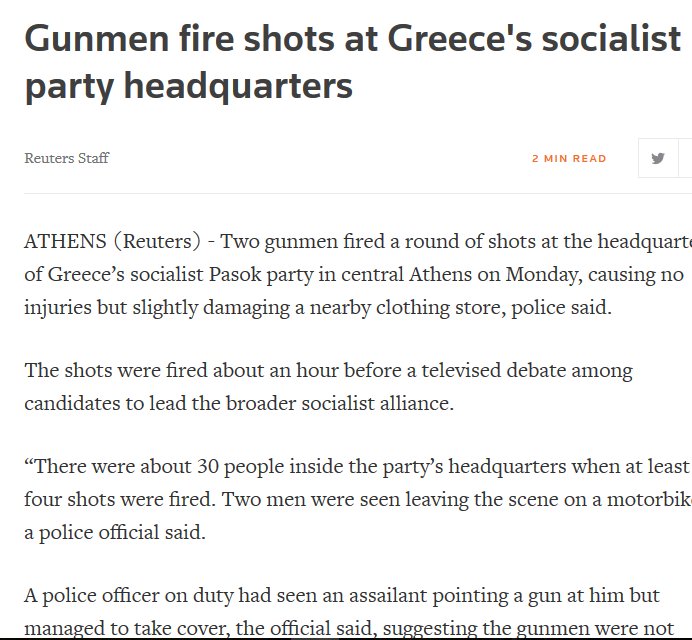Όπως αναφέρεται στο δημοσίευμα «δύο ένοπλοι πυροβόλησαν ενάντια στα κεντρικά γραφεία του σοσιαλιστικού κόμματος ΠΑΣΟΚ στο κέντρο της Αθήνας, προκαλώντας κάποιους τραυματισμούς και ελαφρές φθορές σε παρακείμενο κατάστημα, σύμφωνα με αστυνομικές πηγές.