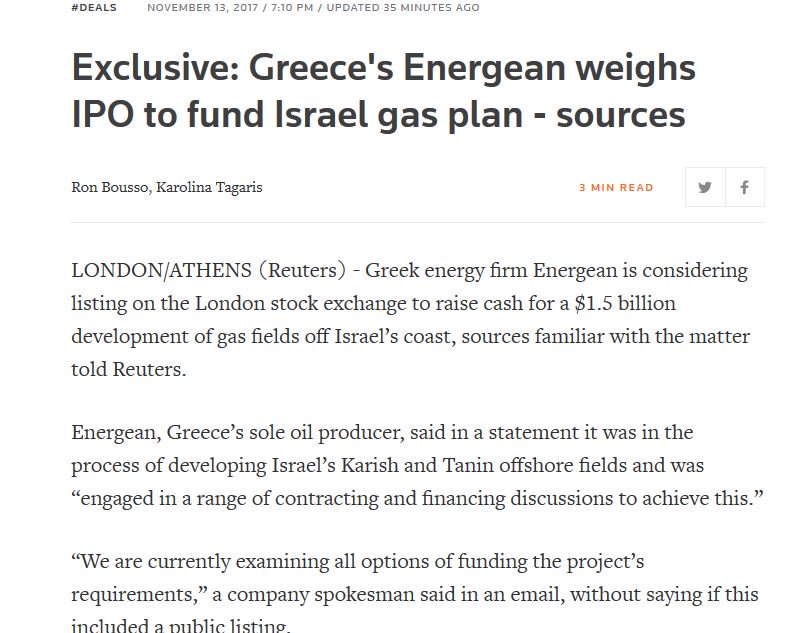 Η Energean, η οποία είναι ο μοναδικός παραγωγός πετρελαίου της Ελλάδας, δήλωσε σε ανακοίνωσή της του ότι βρίσκεται στο στάδιο της ανάπτυξης των παράκτιων πεδίων Karish και Tanin του Ισραήλ και "συμμετέχει σε μια σειρά συζητήσεων για τη σύναψη συμβάσεων και χρηματοδότησης για να επιτευχθεί αυτό".