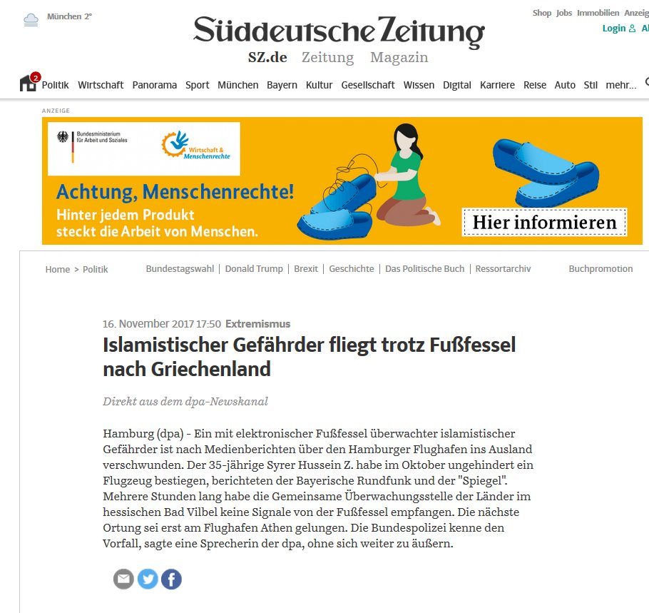 Σύμφωνα με το δημοσίευμα ο εν λόγω ισλαμιστής, ο οποίος φορούσε ειδικό βραχιολάκι εντοπισμού στο πόδι του, είναι ο 35χρονος Σύριος Hussein Z., κατόρθωσε να επιβιβαστεί σε αεροπλάνο στα τέλη Οκτωβρίου, χωρίς να γίνει αντιληπτός από τις γερμανικές αρχές.