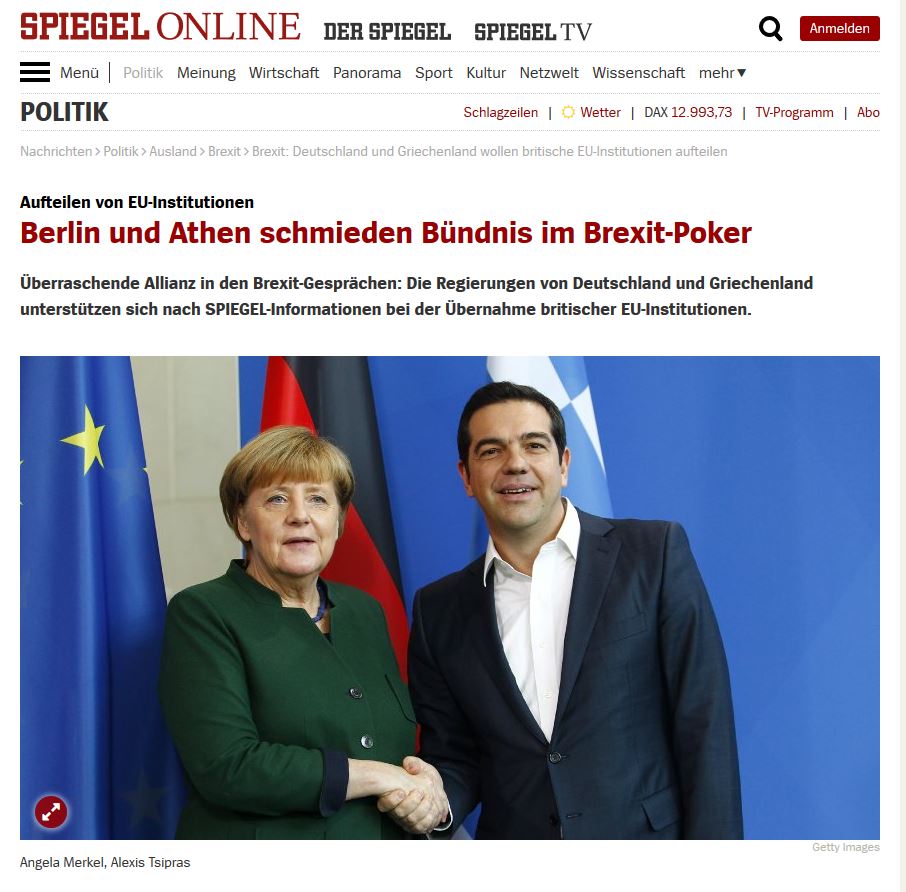 Σε μια ιδιότυπη συμμαχία προχώρησαν ο πρωθυπουργός Αλέξης Τσίπρας και η καγκελάριος της Γερμανίας Angela Merkel, με στόχο το αμοιβαίο όφελος από το Brexit, σύμφωνα με δημοσίευμα του Spiegel.