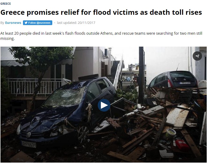 Στην απόφαση της κυβέρνησης να αποζημιώσει τους πληγέντες από τις πλημμύρες στη Δυτική Αττική, αναφέρεται με δημοσίευμά του το Euronews.
