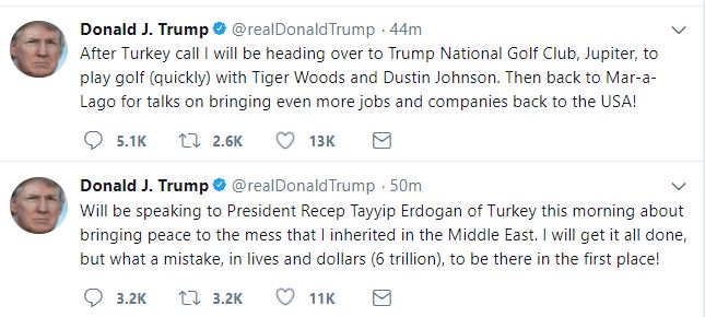 Όπως αναφέρει ο Trump, θα επικοινωνήσει τηλεφωνικά με τον Erdogan με στόχο την ειρήνη στη Μέση Ανατολή μετά το χάος που «κληρονόμησε».