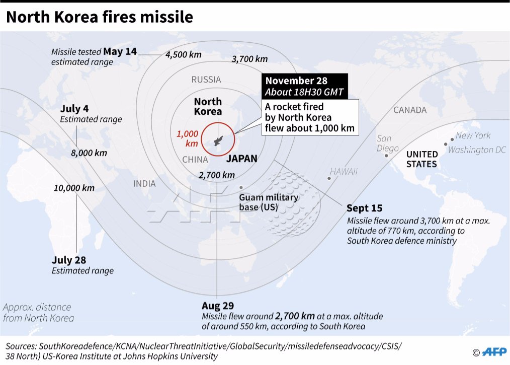 Όπως μετέδωσε η βορειοκορεατική κρατική τηλεόραση, η Β. Κορέα δοκίμασε με επιτυχία έναν διηπειρωτικό βαλλιστικό πύραυλο (ICBM) νέου τύπου, τον Hwasong-15, με δραστικό βεληνεκές το οποίο επιτρέπει στην Πιονγκγιάνγκ να «πλήξει το σύνολο της αμερικανικής ηπείρου».