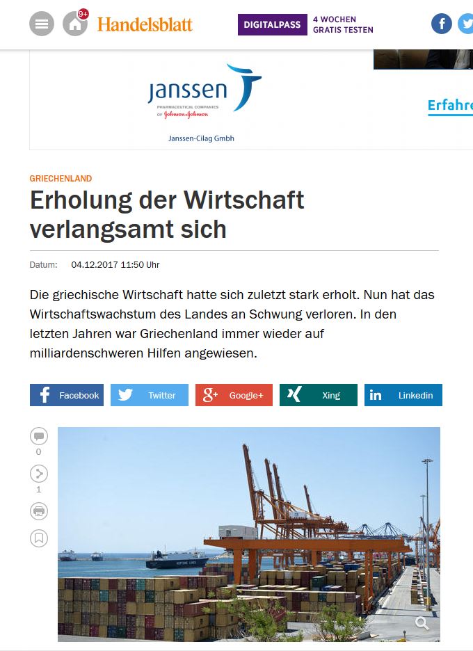Στη χαλάρωση του ρυθμού ανάπτυξης της ελληνικής οικονομίας στο γ’ τρίμηνο του 2017 σε σύγκριση με τα δύο προηγούμενα αναφέρεται δημοσίευμα της η γερμανική εφημερίδα Handelsblatt.