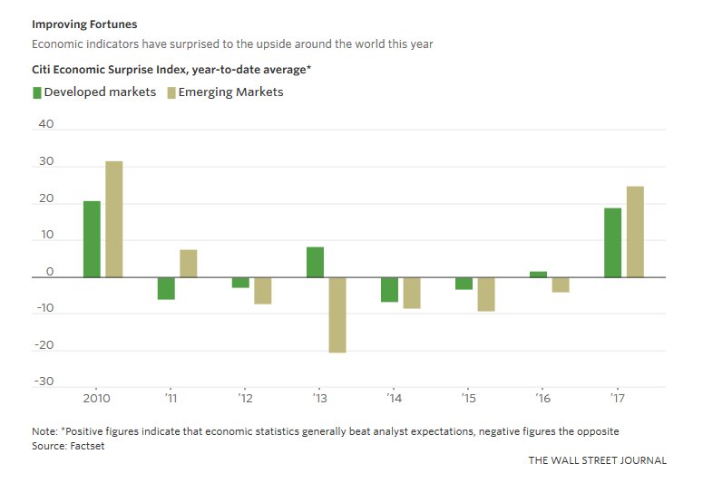 Την ίδια ώρα ο δείκτης Citi Global Economic Surprise Index, ο οποίος μετρά εάν τα οικονομικά στοιχεία που ανακοινώνονται είναι καλύτερα ή χειρότερα των εκτιμήσεων των αναλυτών, εμφανίζει την καλύτερη πορεία από το 2010, τόσο για τις αναδυόμενες όσο και για τις ανεπτυγμένες αγορές.