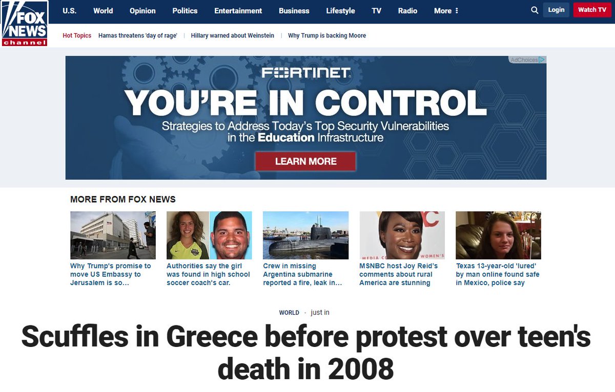 Στα επεισόδια που διαδραματίστηκαν στο κέντρο της Αθήνας την Τετάρτη 6 Δεκεμβρίου 2017, στην επέτειο για το θάνατο του Αλέξη Γρηγορόπουλου, αναφέρεται με δημοσίευμά του το Foxnews.