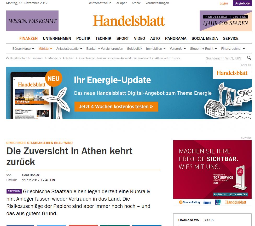 Την εκτίμηση ότι επιστρέφει στην Ελλάδα η εμπιστοσύνη των επενδυτών τονίζει σε δημοσίευμά της η γερμανική εφημερίδα Handelsblatt.