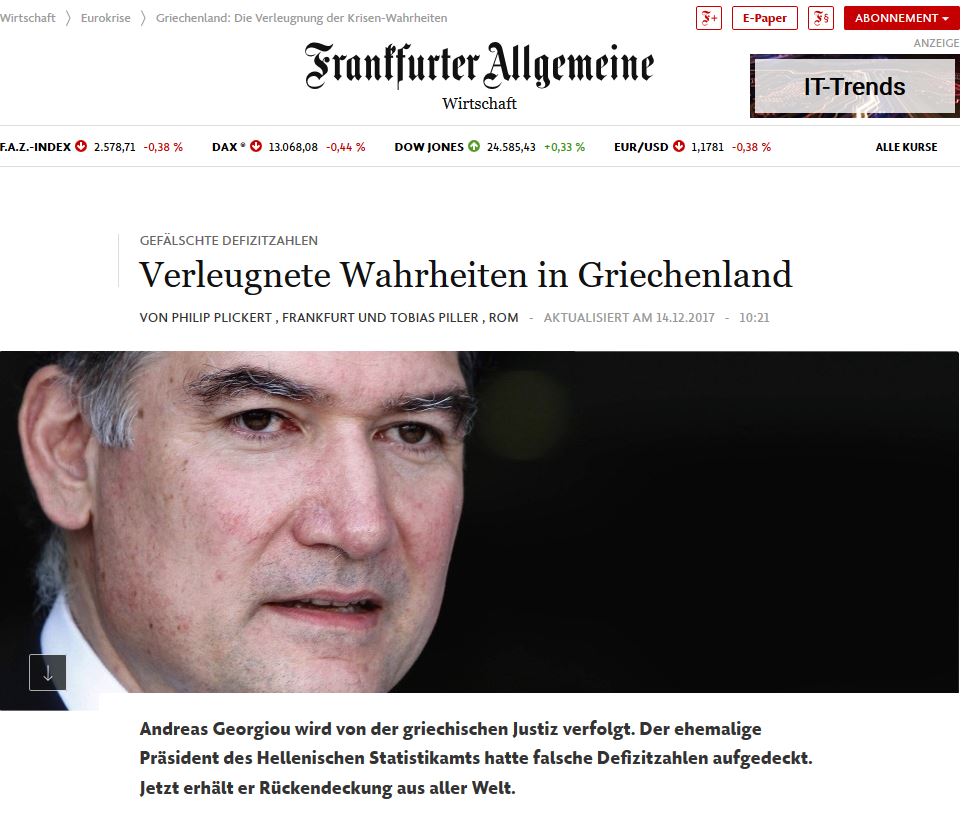 Στην εκστρατεία συλλογής υπογραφών που ξεκίνησε η Αμερικανική Στατιστική Ένωση (ASA) υπέρ του πρώην επικεφαλής της ΕΛΣΤΑΤ Ανδρέα Γεωργίου αναφέρεται η Frankfurter Allgemeine Zeitung.