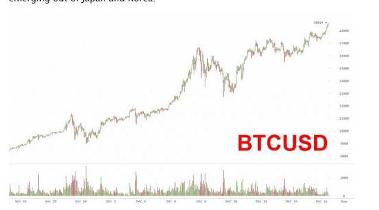 Μετά από μερικές μέρες διαπραγμάτευσης μεταξύ 16.500 -17.500 δολαρίων το δημοφιλές ψηφιακό νόμισμα κατέγραψε σήμερα (16/12) νέο υψηλό ρεκόρ μετά από ένα κύμα εξαγοράς, προερχόμενο από τις αναδυόμενες αγορές της Ασίας, της Ιαπωνίας και της Νότιας Κορέας.