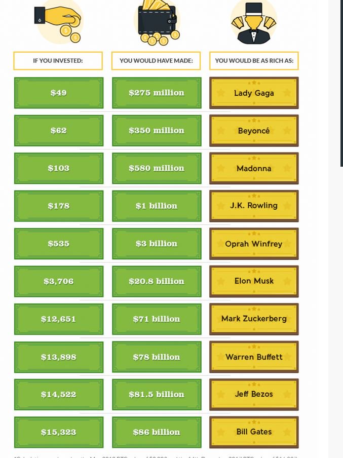 Σύμφωνα με την ανάλυση του Coinlist εάν κάποιος είχε επενδύσει 49 δολάρια το 2010, τώρα θα είχε την ίδια περιουσία με τη Lady Gaga 275 εκατ. δολάρια, ενώ με 62 δολάρια θα έφτανε την περιουσία της της Beyonce 350 εκατ. δολάρια.