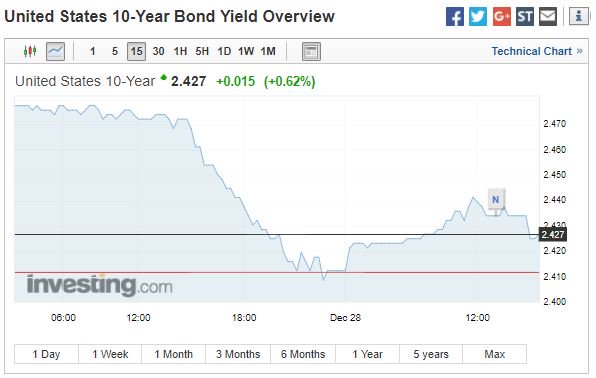 Ειδικότερα, η απόδοση του αμερικανικού 10ετούς ομολόγου ενισχύεται ελαφρώς στο 2,433%, έναντι του 2,412% που είχε «αγγίξει» χθες (27/12), όταν κατέγραψε τη μεγαλύτερη ημερήσια πτώση από τις 5 Σεπτεμβρίου 2017.