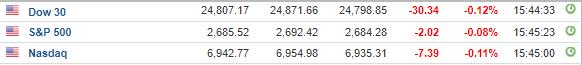 Περί τις 17:45, ο Dow Jones Industrial average υποχωρούσε κατά 0,15%, στις 24.800,98 μονάδες, ο S&P 500 κατέγραφε απώλειες 0,12% και κινείτο στις 2.684,28 μονάδες, ενώ ο Nasdaq κινείτο κατά 0,22% χαμηλότερα, στις 6.935,09 μονάδες.