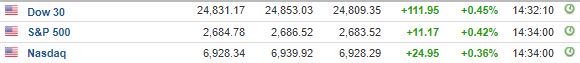 Περί τις 16:30, ο Dow Jones Industrial average ενισχυόταν κατά 0,48%, στις 24.838,80 μονάδες, ο S&P 500 κατέγραφε κέρδη 0,32% και κινείτο στις 2.682,28 μονάδες, ενώ ο Nasdaq κινείτο κατά 0,48% υψηλότερα, στις 6.936,55 μονάδες.