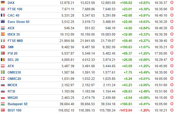 Ο DAX στη Γερμανία ενισχύθηκε κατά 0,83%, στις 12.978,21 μονάδες, ο FTSE 100 στο Λονδίνο κατέγραψε κέρδη 0,30% και έκλεισε στις 7.671,11 μονάδες, ενώ ο CAC 40 στο Παρίσι έκλεισε κατά 0,81% υψηλότερα, στις 5.331,28 μονάδες.