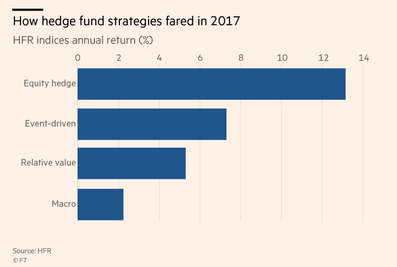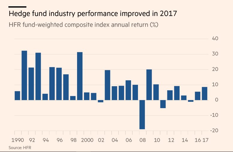 Ιδιαίτερα θετική ήταν η πορεία των κεφαλαίων αντιστάθμισης κινδύνου (hedge funds) το 2017, καθώς πέτυχαν τις καλύτερες αποδόσεις από το 2013, λόγω της υψηλής έκθεσής τους σε μετοχές.