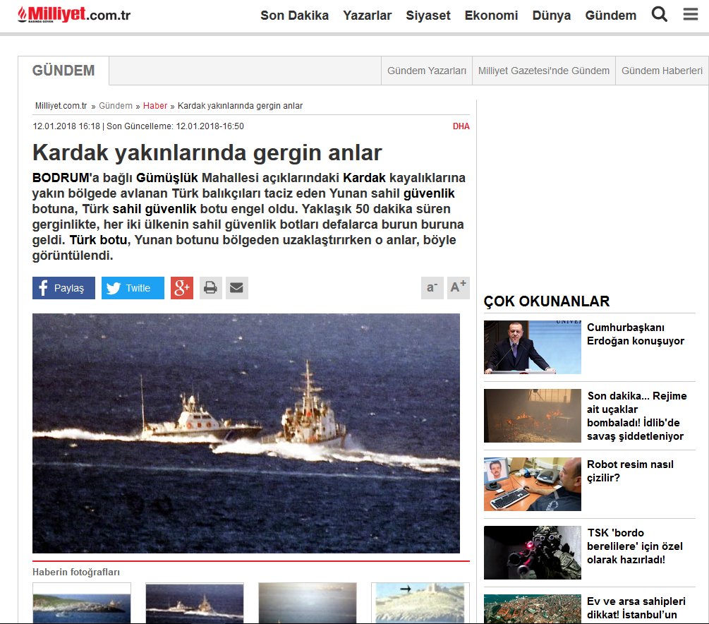 Σύμφωνα με την τουρκική εφημερίδα, τούρκοι ψαράδες βρίσκονταν 3,5 μίλια από την ακτή του Γκιουμουσλούκ κοντά στα Ίμια, όταν παρενοχλήθηκαν στις 11:45 από σκάφος της ελληνικής Ακτοφυλακής που ξεκίνησε από τη Λέρο.