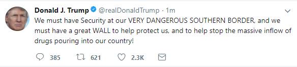 «Πρέπει να έχουμε ασφάλεια στα πολύ επικίνδυνα νότια σύνορά μας και πρέπει να έχουμε ένα σπουδαίο τείχος για να προστατεύσουμε τους εαυτούς μας και να βοηθήσουμε να σταματήσουμε τη μαζική εισροή ναρκωτικών στη χώρα μας!», ανέφερε σε ανάρτησή του στο «Twitter» ο Trump.