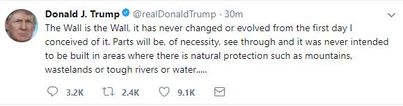 Κάποια τμήματα θα είναι, αναγκαστικά, διαφανή και δεν προορίζονταν ποτέ να χτιστούν σε περιοχές που βρίσκονται υπό φυσική προστασία όπως βουνά, άγονη γη, ποτάμια ή νερό…», ανέφερε με ανάρτησή του στο «Twitter» ο Trump.