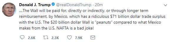 «Το Τείχος θα πληρωθεί άμεσα ή έμμεσα ή μέσω μιας μακροπρόθεσμης αποζημίωσης, από το Μεξικό, το οποίο έχει ένα παράλογο εμπορικό πλεόνασμα ύψους 71 δισ. δολ. με τις ΗΠΑ.