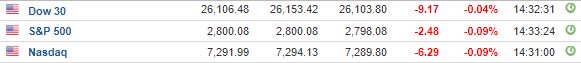 Περί τις 16:30, ο Dow Jones Industrial average υποχωρούσε κατά 0,04%, στις 26.106,48 μονάδες, ο S&P 500 κατέγραφε απώλειες 0,10% και κινείτο στις 2.800,08 μονάδες, ενώ ο Nasdaq κινείτο κατά 0,03% χαμηλότερα, στις 7.295,79 μονάδες.