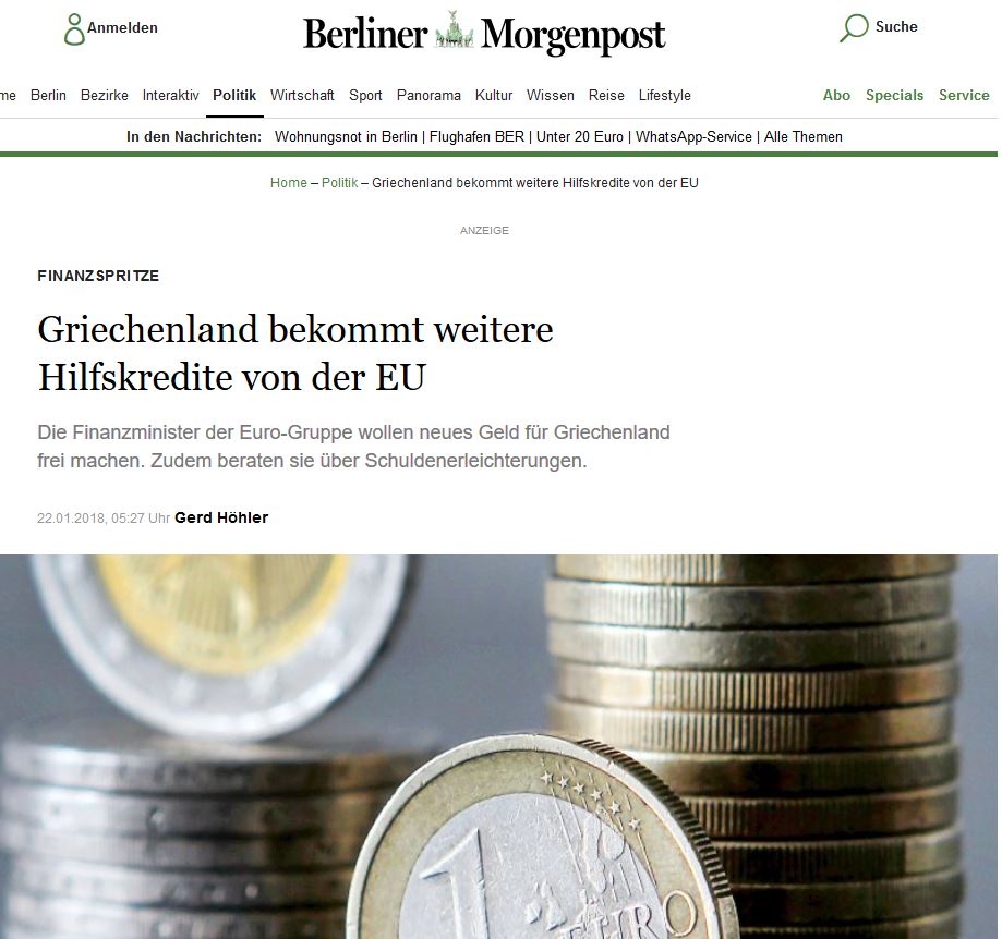 "Φρέσκα" χρήματα για την Ελλάδα, το Eurogroup θα αποδεσμεύσει σήμερα 22/1 ακόμα μια δόση προς την Ελλάδα, τονίζει σε άρθρο της Berliner Morgenpost.