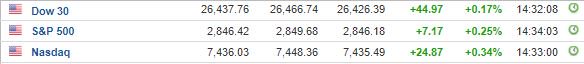 Περί τις 16:30, ο Dow Jones Industrial average ενισχυόταν κατά 0,15%, στις 26.432,19 μονάδες, ο S&P 500 κατέγραφε κέρδη 0,30% και κινείτο στις 2.847,68 μονάδες, ενώ ο Nasdaq κινείτο κατά 0,36% υψηλότερα, στις 7.438,10 μονάδες.