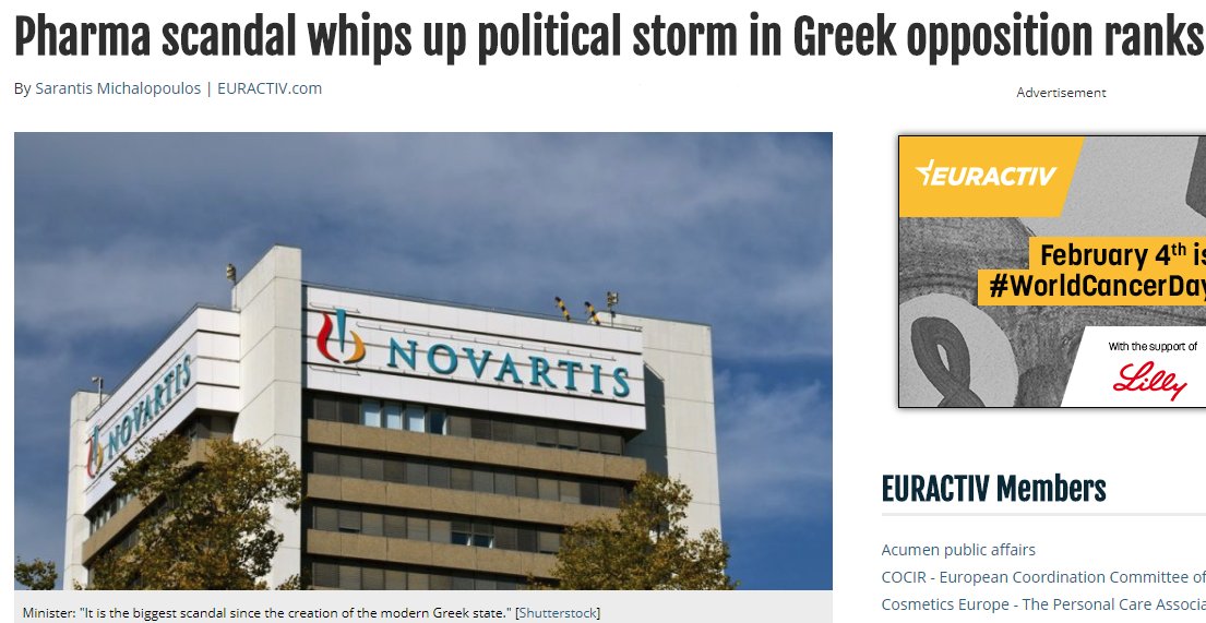 Μία έρευνα σχετικά με τις παράνομες πρακτικές της ελβετικής φαρμακοβιομηχανίας Novartis στην Ελλάδα, που εμπλέκει χιλιάδες κρατικούς αξιωματούχους και γιατρούς, άνοιξε το κουτί της Πανδώρας στον πολιτικό χώρο, καθώς τα τοπικά μέσα ενημέρωσης ονόμασαν δέκα πρώην μεγάλα στελέχη από κόμματα της αντιπολίτευσης ως στόχο της έρευνας, αναφέρει η αγγλόφωνη έκδοση του Euractiv σε δημοσίευμά του.