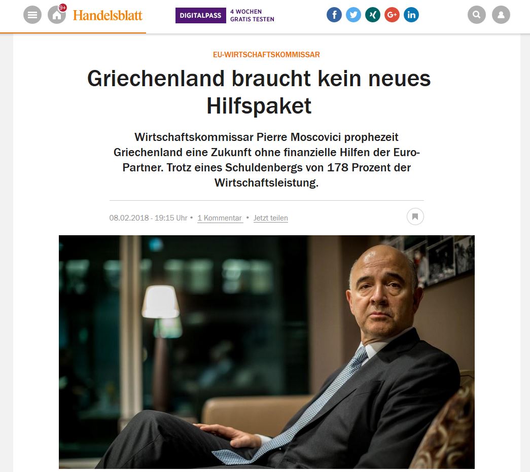 Ηandelsblatt: Η Ελλάδα δε χρειάζεται τέταρτο μνημόνιο δηλώνει ο Moscovici