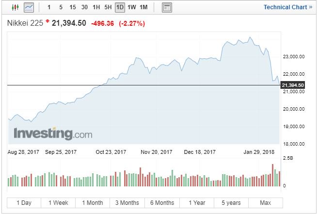 Ο δείκτης Nikkei 225 στο Τόκιο έκλεισε με πτώση 2,32% στις 21.382 μονάδες, με την εβδομαδιαία πτώση να διαμορφώνεται στο 8,1%, τη μεγαλύτερη από τον Φεβρουάριο του 2016.