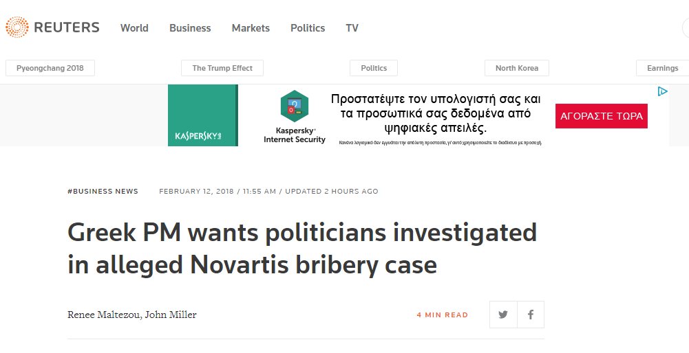 Ο πρωθυπουργός της Ελλάδας τη Δευτέρα 12 Φεβρουαρίου 2017, κάλεσε το κοινοβούλιο να ξεκινήσει έρευνα για πολιτικούς σε υποτιθέμενη υπόθεση δωροδοκίας, ενώ η ελβετική φαρμακοβιομηχανία Novartis υποσχέθηκε να αναλάβει δράση αν η έρευνα διαπιστώσει παράνομη συμπεριφορά, αναφέρει σε δημοσίευμά του το πρακτορείο Reuters.