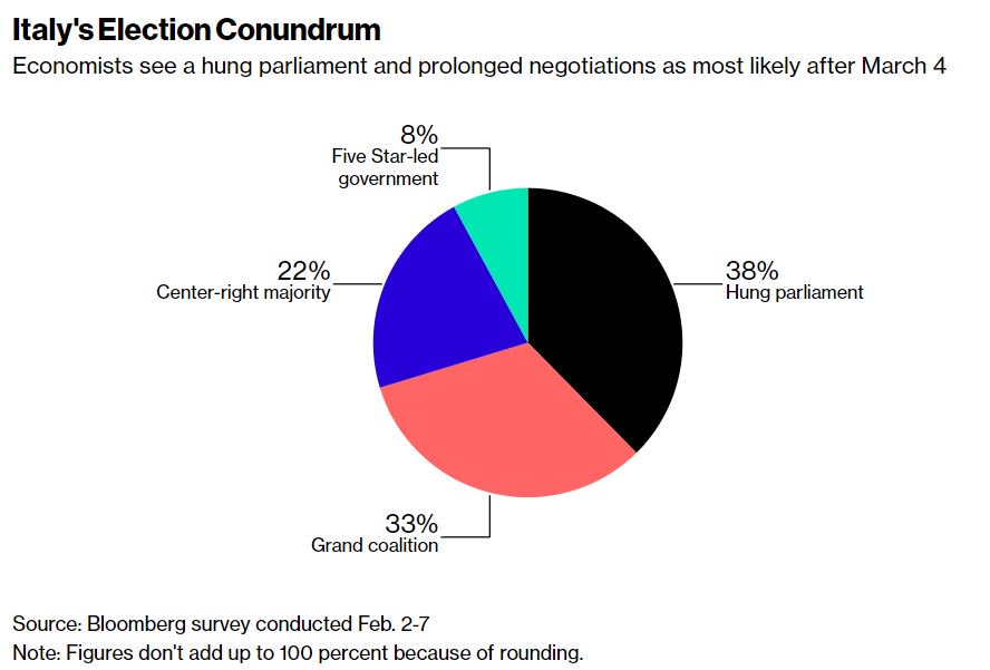 Όπως προκύπτει από έρευνα του Bloomberg μεταξύ οικονομολόγων, υπάρχει 38% πιθανότητα μη σχηματισμού κυβέρνησης, ακολουθούμενη από μία στις τρεις πιθανότητα για ένα Μεγάλο Συνασπισμό μεταξύ του Δημοκρατικού Κόμματου πρώην πρωθυπουργού Matteo Renzi και του πιο συντηρητικού Forza Italia του Silvio Berlusconi.