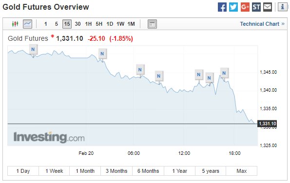Έτσι, η τιμή του συμβολαίου του χρυσού παραδόσεως Απριλίου έκλεισε με απώλειες 1,9% ή 25,10 δολ., στα 1.331,20 ανά ουγγιά, καταγράφοντας τη χειρότερη ημερήσια πτώση από τις 15 Δεκεμβρίου 2016, όταν είχε διολισθήσει κατά 2,9%, σύμφωνα με στοιχεία της FactSet.