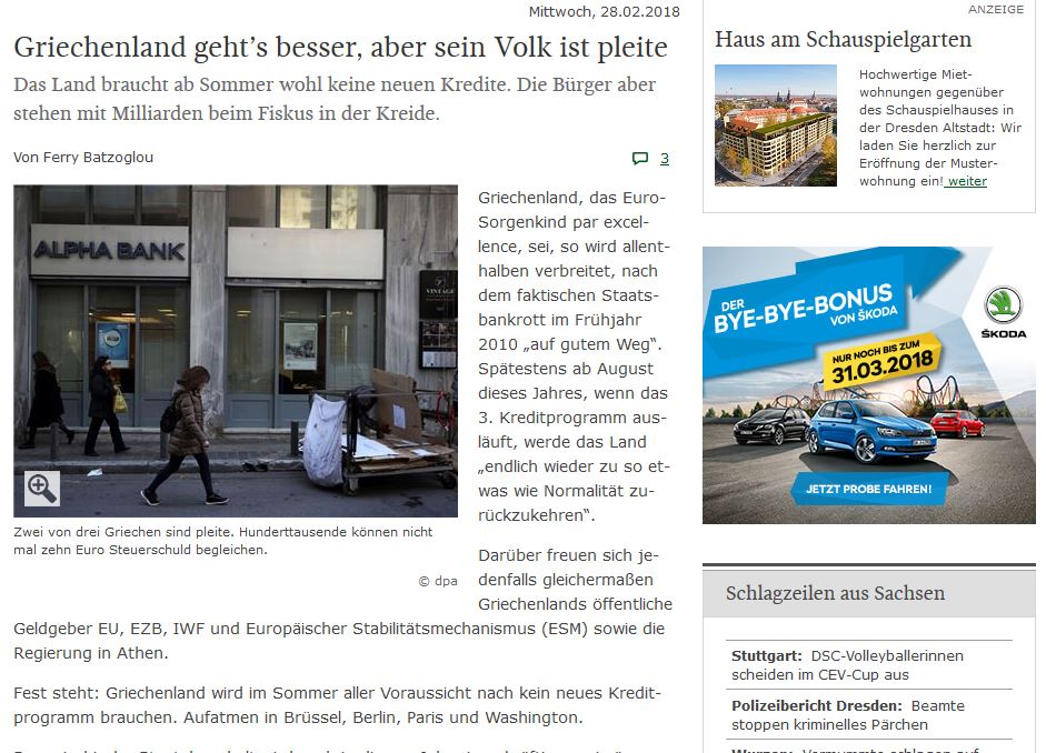«Η Ελλάδα πάει καλύτερα, αλλά ο λαός της έχει χρεοκοπήσει», αυτός είναι ο τίτλος υπό τον οποίο η εφημερίδα Sächsische Zeitung δημοσιεύει ρεπορτάζ στο οποίο αναλύεται η οικονομική πορεία της Ελλάδας σε αντιδιαστολή με εκείνη των πολιτών της: «Μετά το καλοκαίρι η χώρα φαίνεται ότι δεν θα χρειαστεί νέα δάνεια.