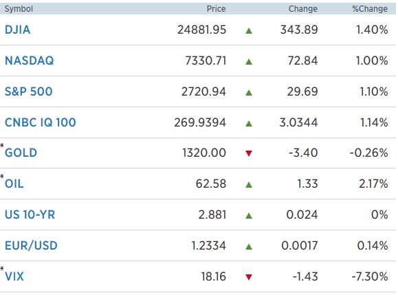 Ο Dow Jones Industrial average ενισχύθηκε κατά 1,4% στις 24.881,95 μονάδες, ο S&P 500 σημείωσε άνοδο 1,1% στις 2.720,94 μονάδες, ενώ ο Nasdaq κατέγραψε κέρδη κατά 1% υψηλότερα, στις 7.330,71 μονάδες.