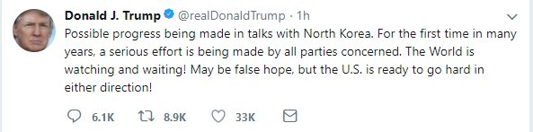Για πρώτη φορά εδώ και χρόνια, καταβάλλεται μια σοβαρή προσπάθεια απ’ όλες τις ενδιαφερόμενες πλευρές», έγραψε στο «Twitter» ο Trump.