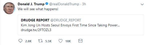 «Πιθανή πρόοδο» στο ζήτημα της Βόρειας Κορέας δήλωσε σήμερα (6/3/2018) ότι «βλέπει» ο πρόεδρος των ΗΠΑ, Donald Trump, καθώς η Νότια Κορέα ανακοίνωσε νωρίτερα ότι η Πιονγκγιάνγκ προτίθεται να συζητήσει μια ενδεχόμενη αποπυρηνικοποίηση, αν δοθούν εγγυήσεις για την ασφάλεια του καθεστώτος.