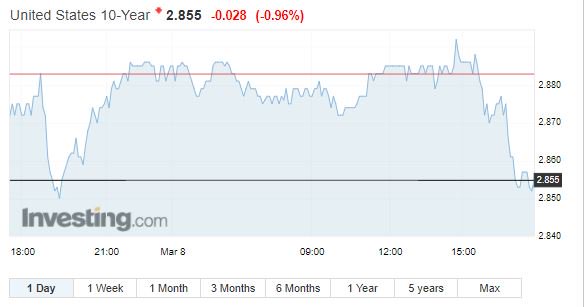 Στον απόηχο των ανακοινώσεων της ΕΚΤ, η απόδοση του 10ετούς ομολόγου των ΗΠΑ υποχώρησε στο 2,85%.