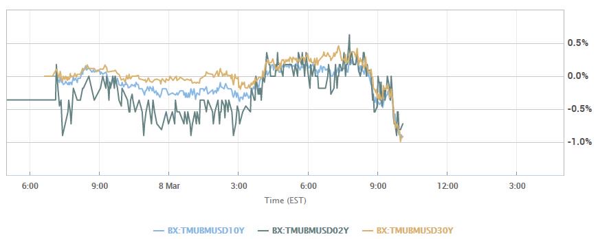 Πτωτικά κινούνται σήμερα (8/3/2018) οι αποδόσεις των κρατικών ομολόγων των ΗΠΑ, στον απόηχο της απόφασης της Ευρωπαϊκής Κεντρικής Τράπεζας (ΕΚΤ) να εγκαταλείψει τη δέσμευση για αύξηση του προγράμματος ποσοτικής χαλάρωσης (QE).