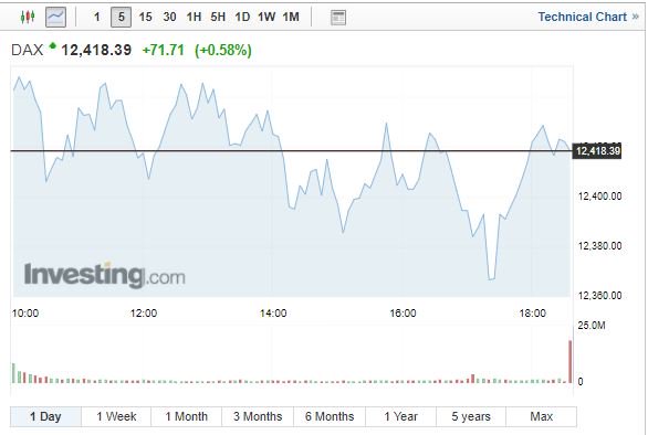 Ο DAX στη Φρανκφούρτη ενισχύθηκε κατά 0,58%, στις 12.418,39 μονάδες, ενώ ο CAC 40 στο Παρίσι σημείωσε οριακή άνοδο 0,04%, στις 5.276,71 μονάδες.