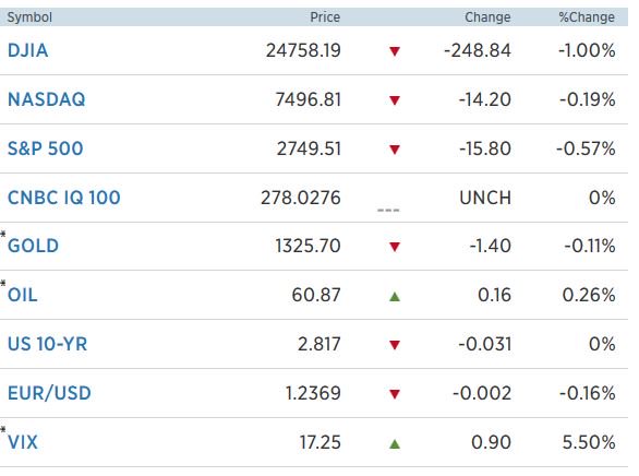 Ο Dow Jones Industrial average υποχώρησε κατά 1% στις 24.758,19 μονάδες, ο S&P 500 σημείωσε πτώση 0,57% στις 2.749,51 μονάδες, ενώ ο Nasdaq κατέγραψε απώλειες κατά 0,19% χαμηλότερα, στις 7.496,81 μονάδες.