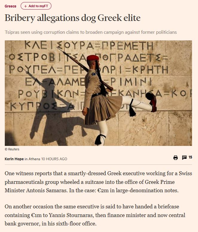 Ο Έλληνας πρωθυπουργός Αλέξης Τσίπρας με τις υποθέσεις διαφθοράς διευρύνει την εκστρατεία του ενάντια στην πολιτική ελίτ της χώρας, μετά από οκτώ χρόνια οδυνηρών μεταρρυθμίσεων και στενής εποπτείας από τους διεθνείς πιστωτές της, την ΕΕ και το Διεθνές Νομισματικό Ταμείο, αναφέρουν σε δημοσίευμά τους οι Financial Times με αφορμή και τη Novartis.