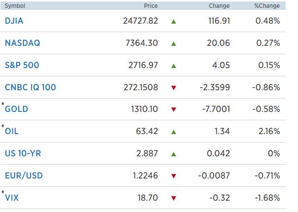Ο Dow Jones Industrial average ενισχύθηκε κατά 0,48%, στις 24.729,68 μονάδες, ο S&P 500 σημείωσε άνοδο 0,15% στις 2.717 μονάδες, ενώ ο Nasdaq κατέγραψε κέρδη κατά 0,27% στις 7.364,3 μονάδες.